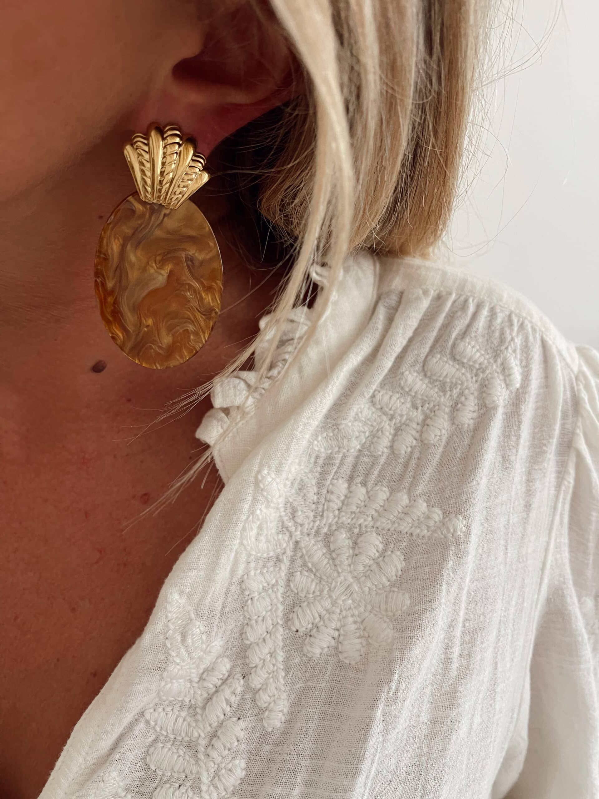Sublimez votre look avec ces boucles d’oreilles, une création intemporelle qui marie délicatesse et raffinement. Ces boucles, avec leurs jolies courbes, sont conçues en acier inoxydable et acétate.